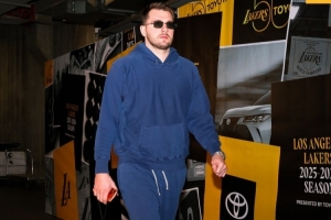 賽前,湖人官方社媒曬出球員入場(chǎng)照,東契奇戴墨鏡帥氣,老詹噸噸桶傍身。